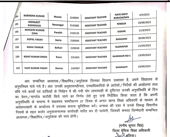 बलिया BSA ने 190 शिक्षक, शिक्षामित्र व अनुदेशकों के खिलाफ बड़ा एक्शन, देखिए पूरी लिस्ट
